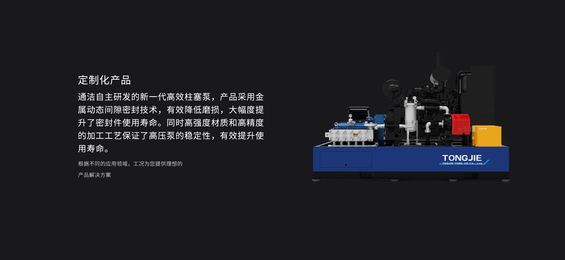 通洁自主研发的新一代高效柱塞泵,产品采用金属动态间隙密封技术,有效降低磨损,大幅度提升了密封件使用寿命。同时高强度材质和高精度的加工工艺保证了高压泵的稳定性,有效提升使用寿命。