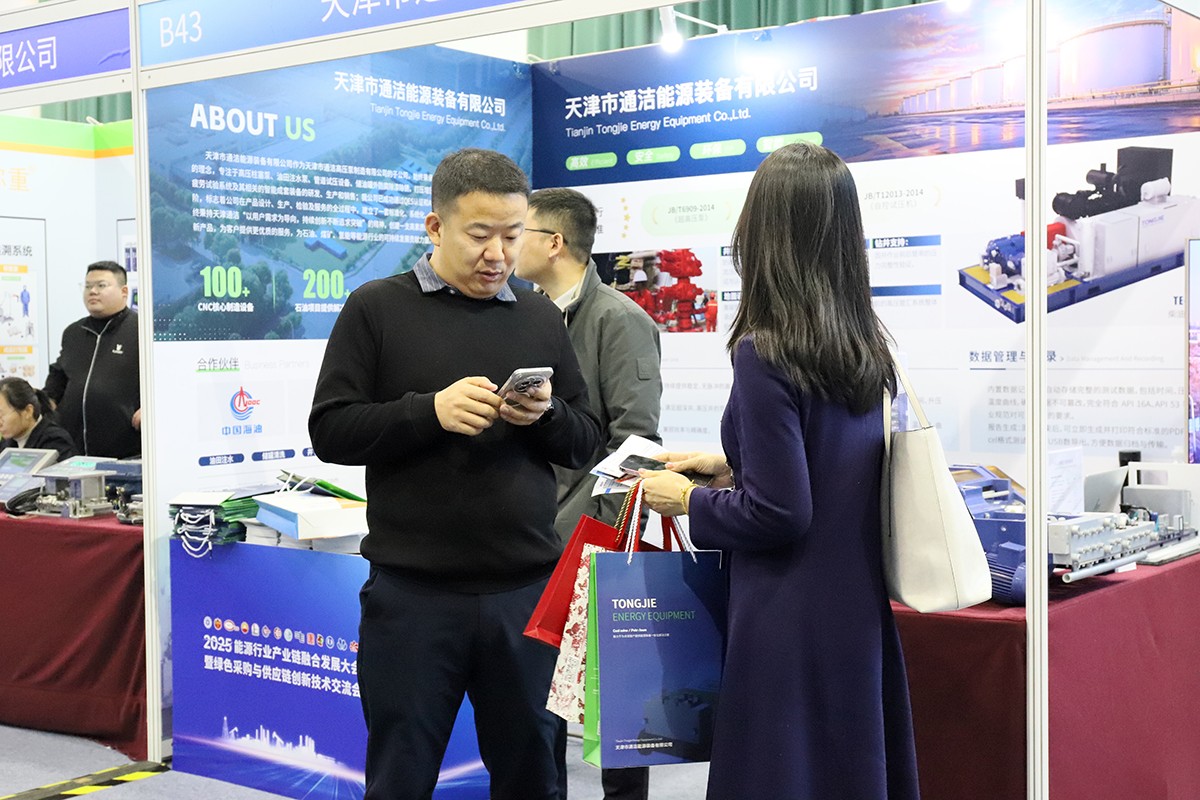 2026年1月8日至9日,由中国设备管理协会、中国能源研究会、中国化工学会联合主办的“2025能源行业产业链融合发展大会暨绿色采购与供应链创新技术交流会”在北京中国石油科技交流中心成功举办。大会以“融合创新·绿色共赢——构建现代化能源供应链新生态”为主题,汇聚了能源产业链各方力量,共同探讨绿色转型与协同发展之路。天津通洁集团子公司——天津市通洁能源装备有限公司在本次大会中参展亮相,系统展示了公司在能源装备领域智能化与绿色化方面的创新成果与技术实力。